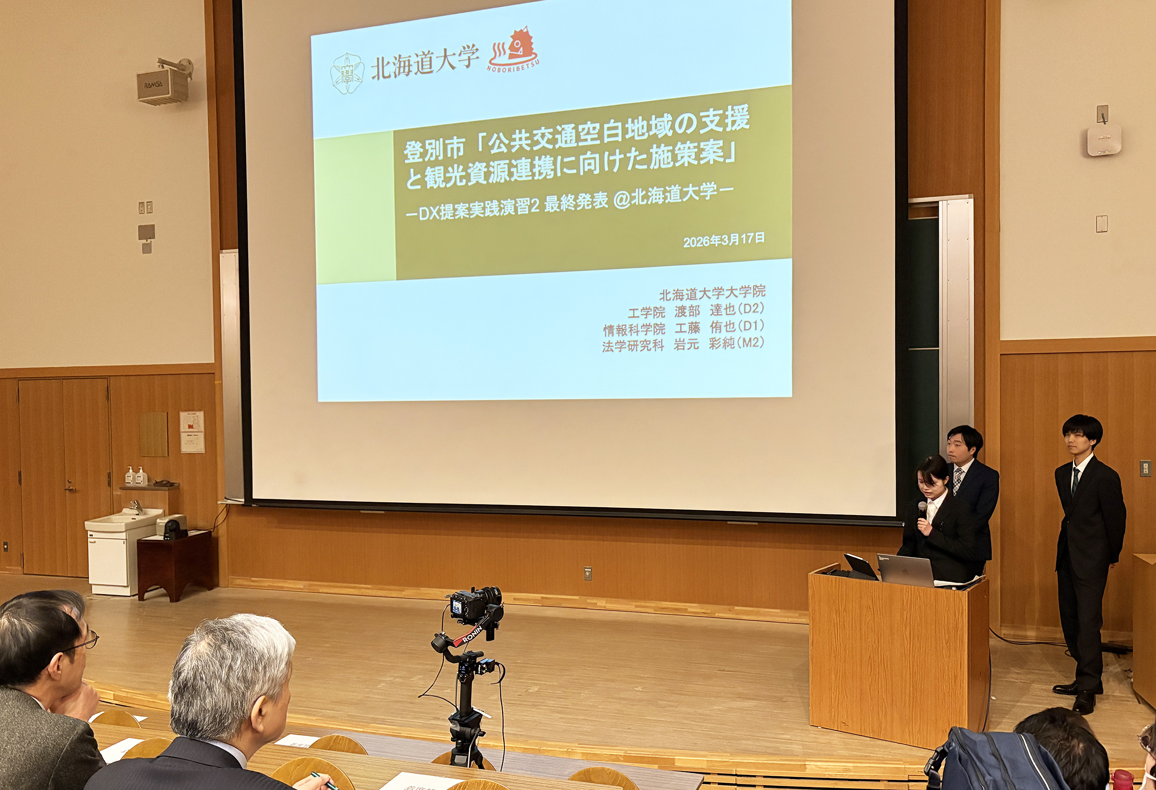 3月17日、理学部大講堂にて、令和7年度の「DX提案実践演習」の最終発表会が行われ、北海道大学の大学院生たちが、自治体の実課題に向き合ってきた成果を発表しました。当日は、富良野市・石狩市を対象としたDX提案プロジェクトに加え、北海道市長会と連携して進められた名寄市、登別市が対象の「北海道都市応援プロジェクト」の報告もあわせて行われ、学生と自治体、企業が協働し、社会課題の解決に取り組む北海道大学の共創教育の実践が印象づけられる場となりました。