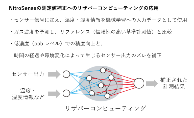ただ、NitroSense はまだ開発初期段階で、取得データが揃い始めたばかりでした。そして、出力にはノイズ、経年劣化、測定環境依存性といった問題が含まれており、そのままでは信頼できる濃度推定が困難でした。従来の補正手法では、こうした特性や窒素化合物の“時間的変動”を十分に扱いきれない点も課題でした。そこで私は、RC が持つ“時間ダイナミクス処理能力”に着目し、複数の入力情報を統合しながら時間発展を考慮した「排出量推定モデル」の構築を提案しました。これにより、より信頼性の高いデータに基づく意思決定が可能になると考えました。